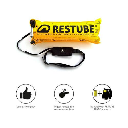 De RESTUBE beach is een innovatief veiligheidsmiddel voor strandbezoekers en zwemmers. Raak je in problemen dan kun je het hoofd boven water houden. Je kunt de RESTUBE boei ook met de mond opblazen voor een grotere zichtbaarheid tijdens het zwemmen in open water en deze als een zwemmersboei achter je aan slepen. Of gebruik de RESTUBE als extra ondersteuning bij het zwemmen of snorkelen.